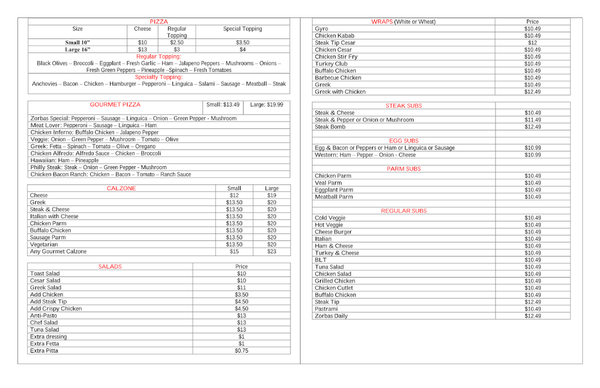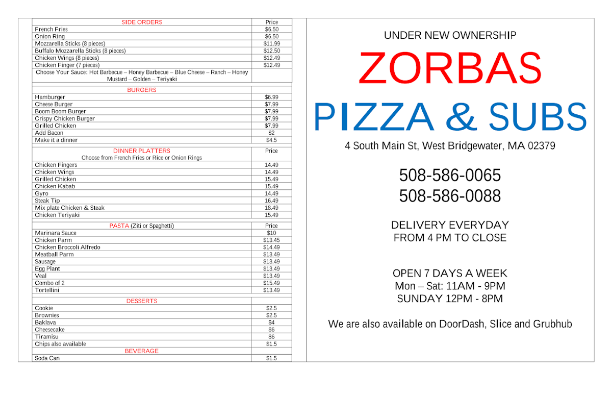 If you’re craving a spot where comfort food actually feels comforting, the Zorbas Pizza & Subs Menu is worth a look. Tucked away at 4 S Main St in West Bridgewater, this place leans into hearty, no-nonsense flavors. You’ll notice right away how the menu jumps from classic cheesy pizzas to generously stuffed subs, and somehow everything sounds like something you’d want after a long day.